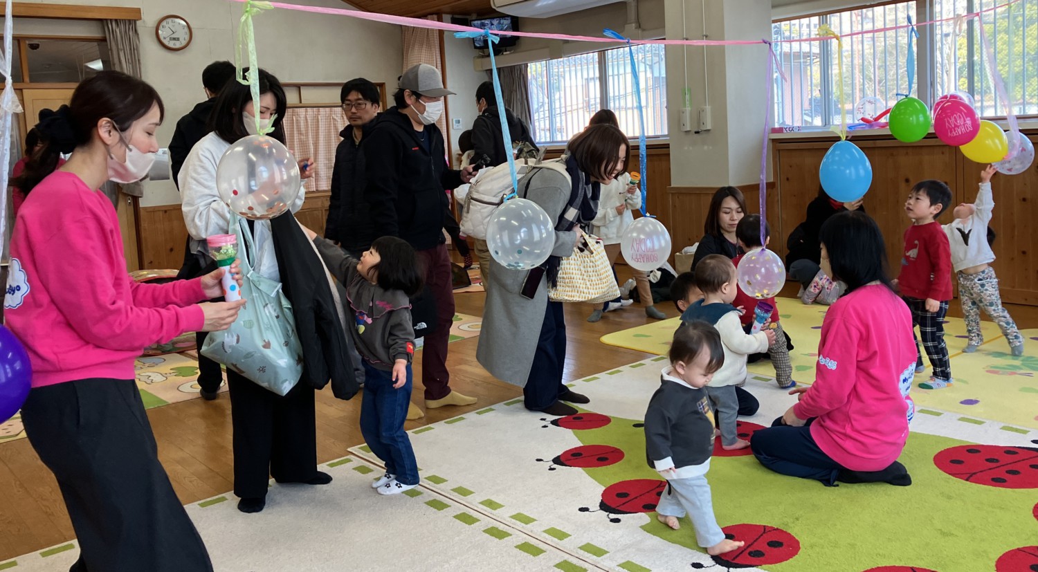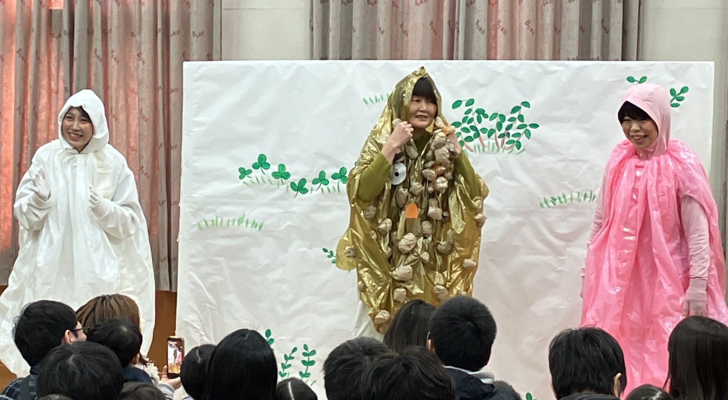 職員による出し物: ハンドベル♪ダーリン,勇気100% や 幕間♪の~ののせるの曲でお手玉 踊り⁉ や絵本から″おしくらまんじゅう″の劇あそび(写真)を楽しみました。