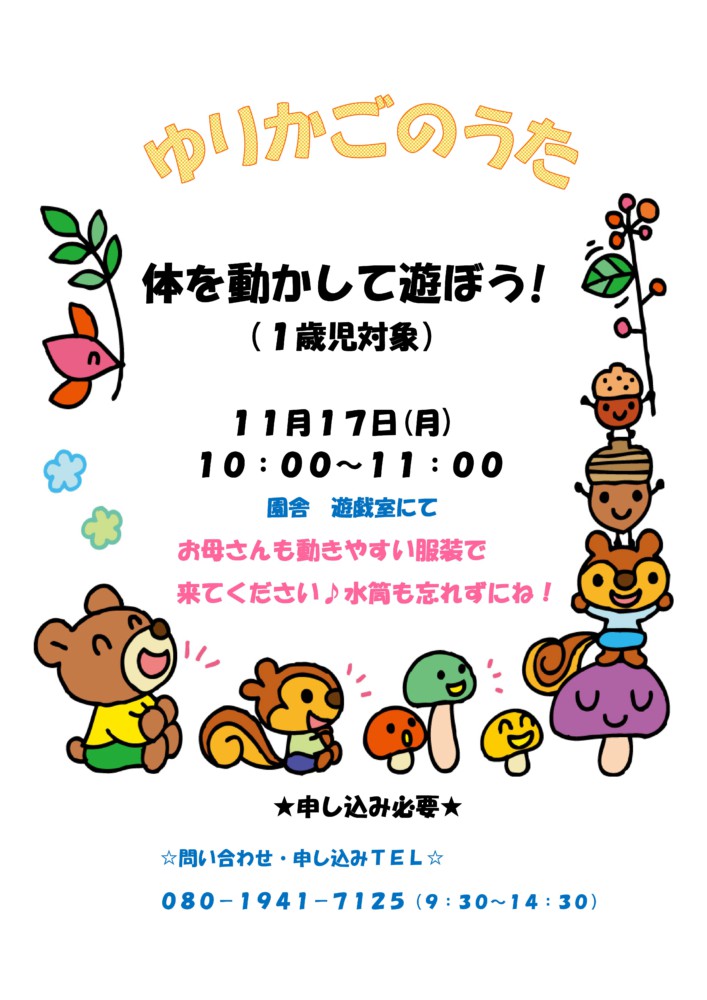 11月 ゆりかごのうた 2025.10.21 ゆりかごブログ こちらの記事も読まれています。R7年度 11月の予定11月 ゆりかごのうた10月 ゆりかごのうた10月 助産師さんと話そうR7年度 10月の予定R7年度 9月の予定 前後の記事 前の記事 10月 ゆりかごのうた 次の記事 R7年度 11月の予定 お気軽にお問い合わせください! 083-922-71267時~19時(18時から延長保育) ソーシャルボタン Tweet こちらの記事も読まれています。R5年度 9月の予定R4年度 11月の予定5月 ゆりかごのうた今日のゆりかごのうたについて おはようございます。 あいにくの雨となり、参加の方が多いので保育所の2階遊戯室で遊びます。 保育所でお待ちしております。 […]R4年度 12月の予定7月 ゆりかごのうた