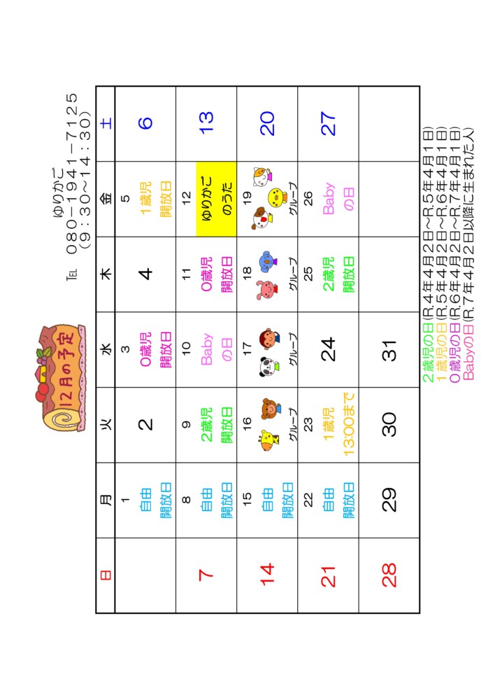 R7年度 12月の予定 2025.11.14 ゆりかごブログ こちらの記事も読まれています。12月 ゆりかごのうた11月 ゆりかごのうたR7年度 11月の予定10月 助産師さんと話そう10月 ゆりかごのうたR7年度 9月の予定 前後の記事 前の記事 12月 ゆりかごのうた お気軽にお問い合わせください! 083-922-71267時~19時(18時から延長保育) ソーシャルボタン Tweet こちらの記事も読まれています。第58回うんどうかい 今年の運動会のテーマは、『きらり☆わんぱく運動会~元気100倍、勇気100%~』 りんごアップルンルン♪(りんご […]R6年度 9月の予定R6年度 12月の予定9月 ゆりかごのうた10月 ゆりかごのうた9月 ゆりかごのうた