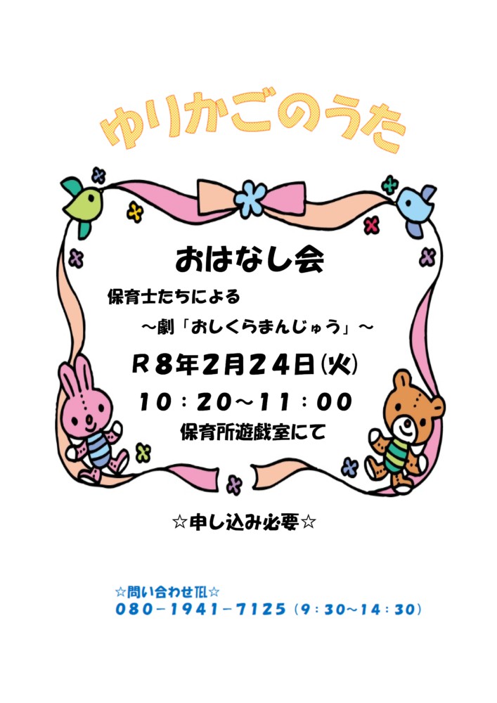 2月 ゆりかごのうた 2026.1.22 ゆりかごブログ こちらの記事も読まれています。R7年度 2月の予定R7年度 1月の予定1月 ゆりかごのうた12月 ゆりかごのうたR7年度 12月の予定11月 ゆりかごのうた 前後の記事 前の記事 R7年度 2月の予定 次の記事 クリスマス会 お気軽にお問い合わせください! 083-922-71267時~19時(18時から延長保育) ソーシャルボタン Tweet こちらの記事も読まれています。R5年度 10月の予定R5年度 4月の予定R7年度 2月の予定R6年度 4月の予定10月 ゆりかごのうた12月 ゆりかごのうた