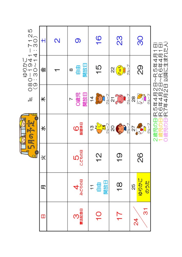 R8年度 5月の予定 2026.4.20 ゆりかごブログ こちらの記事も読まれています。5月 ゆりかごのうたR8年度 4月の予定 今年度は6日からスタートします。このようにホームページの【ゆりかごブログ】で月の予定と講座(ゆりかごのうた)の詳細をお知らせします。 […]4月 ゆりかごのうたR7年度 3月の予定3月 ゆりかごのうたR7年度 2月の予定 前後の記事 前の記事 4月 ゆりかごのうた 次の記事 5月 ゆりかごのうた お気軽にお問い合わせください! 083-922-71267時~19時(18時から延長保育) ソーシャルボタン Tweet こちらの記事も読まれています。9月 ゆりかごのうたR5年度 2月の予定4月 ゆりかごのうたお知らせ ゆりかごの電話番号がかわりました 新 080-1941-7125 […]R6年度 8月の予定R4年度 6月の予定